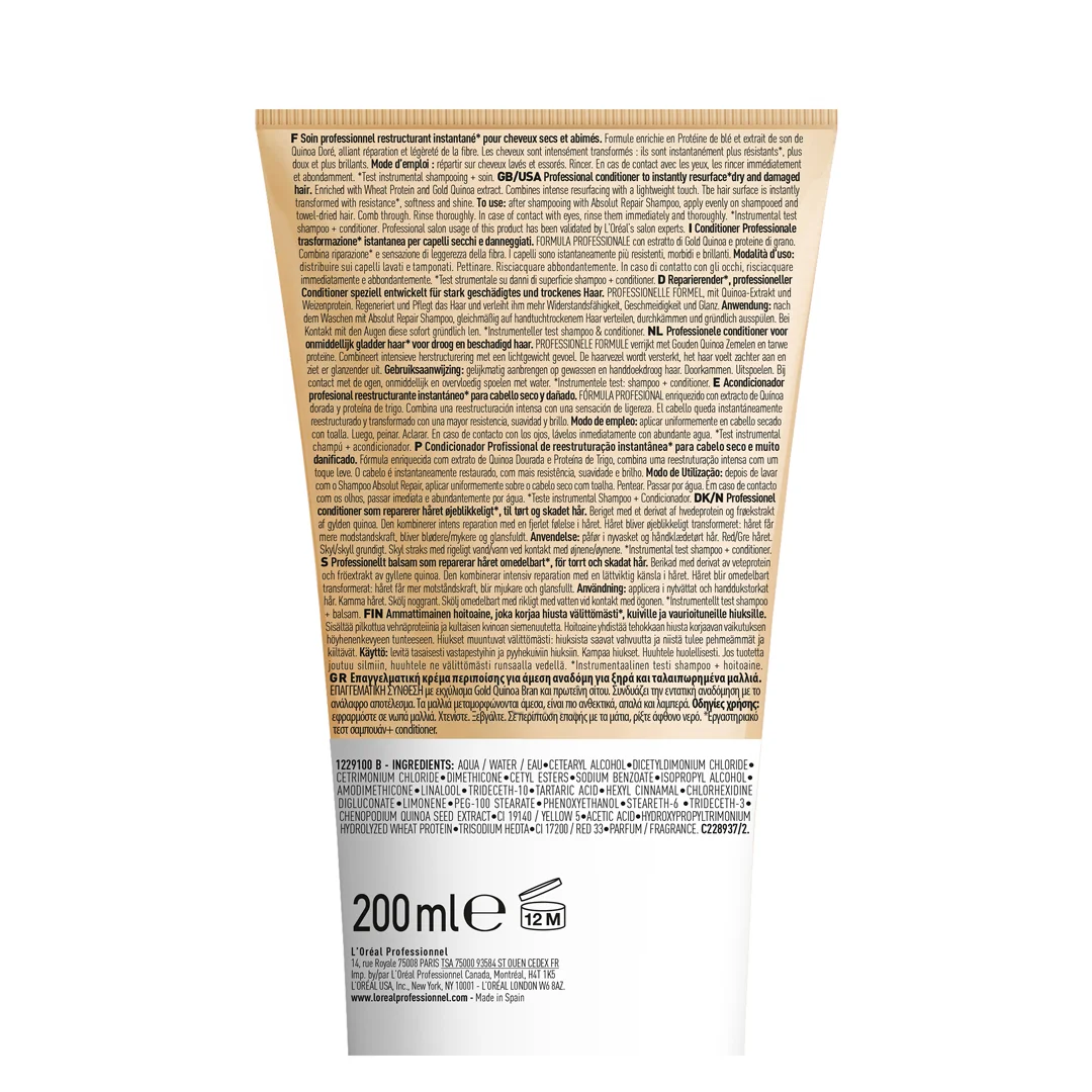 Profesionalna formula obogaćena ekstraktom mekinja zlatne kinoe i proteinom pšenice, trenutno i površinski obnavlja oštećenu kosu i pruža joj negu i sjaj. Kremasta formula neguje vlasi kose, bez otežavanja. U kombinaciji sa Absolut Repair šamponom, kosa je negovana i sjajnija.