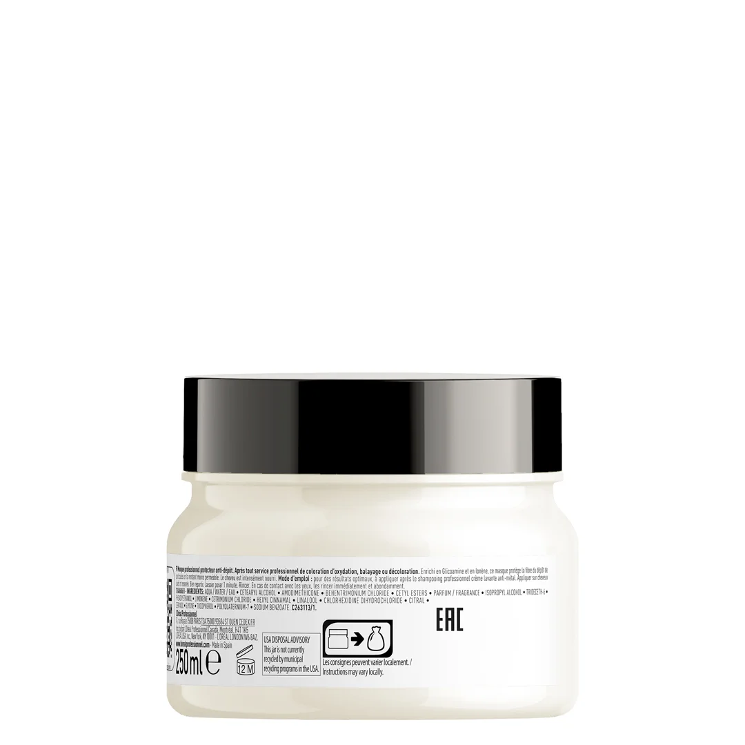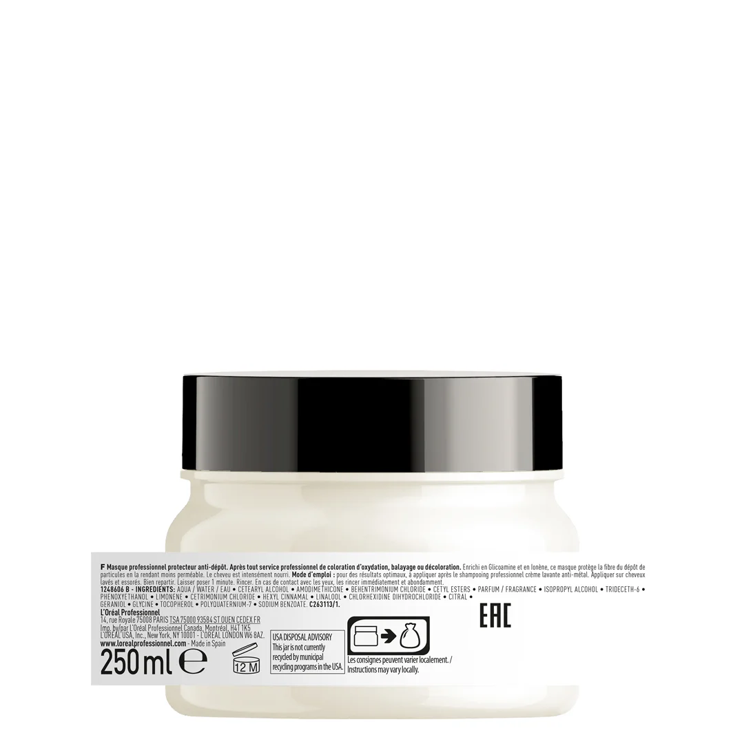 Profesionalna zaštitna maska protiv naslaga. Nakon profesionalnih usluga poput oksidativnog bojenja, balajaža ili posvetljivanja kose. Ova maska, obogaćena glikoaminom i Ionene-om, štiti vlasi od naslaga čestica, čineći je manje poroznom. Kosa je intenzivno negovana.
